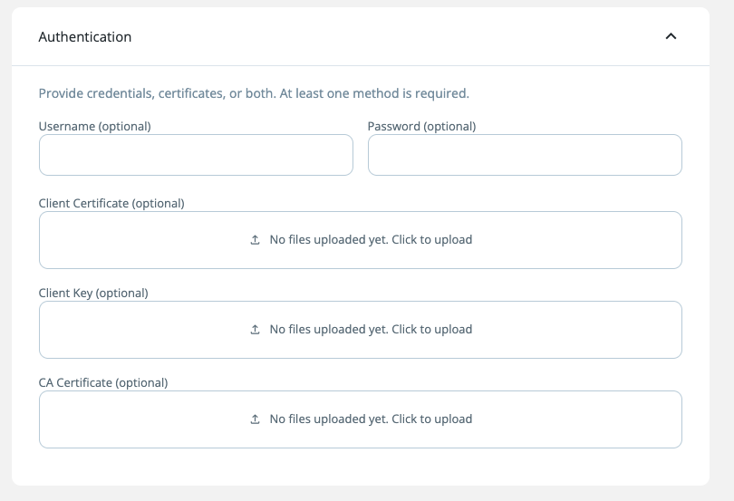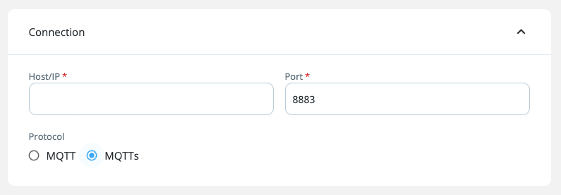 | Protocol + Auth | MQTT only supports BASIC_AUTHENTICATION. MQTT + CERTIFICATE_BASED is not allowed. |